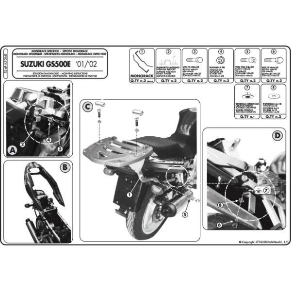 GIVI 526F Monorack Arms are made specifically for Suzuki GS500 (2001-2007). These arms are designed to accept either of the following plates (M3 or MM), which are sold separately, onto which you attach a GIVI Top Box of your choice. All parts needed to mount the GIVI 526F Monorack Arms are included.
