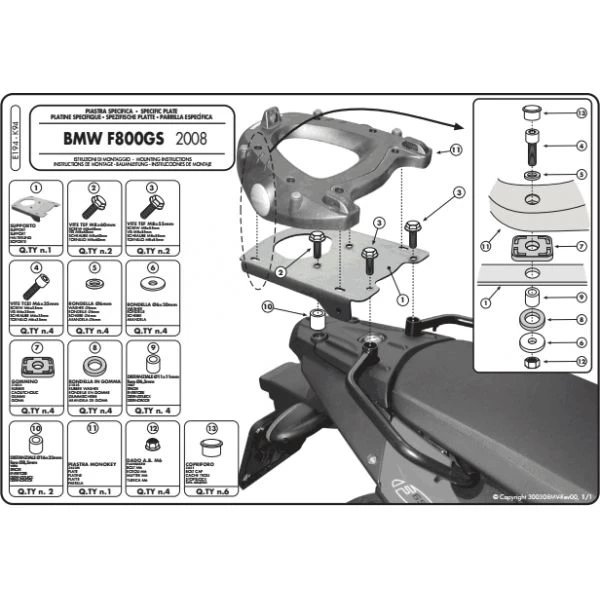 GIVI E194 Top Box Adapter Plate Monokey is made specifically for BMW F650GS and F800GS (2008-2011). The kit is designed to take GIVI Monokey Top Boxes only, All parts needed to mount the GIVI E194 Rear Plate are included. Installs using simple hand tools. Monokey Plate M5 in nylon included in kit.