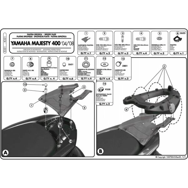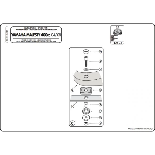 GIVI’s E331 Top Box Adapter Plate, Monokey is made specifically for Yamaha Majesty 400 (2004-2014). The kit is designed to take GIVI Monokey Top Boxes only. All parts needed to mount the GIVI E331 Rear Plate are included. Installs using simple hand tools.