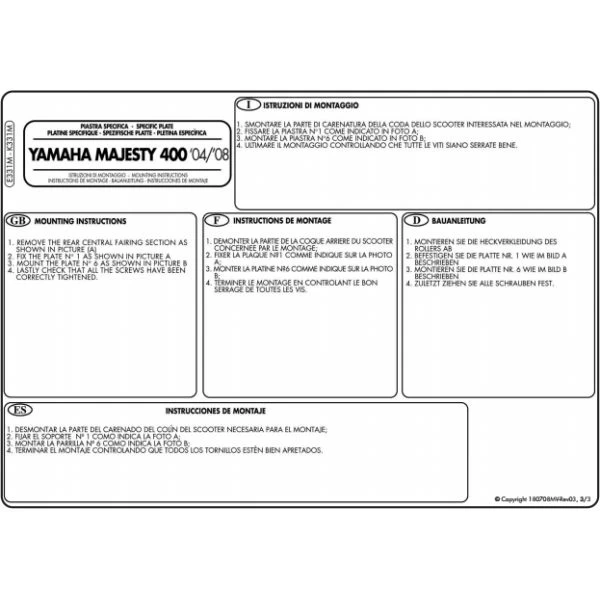 GIVI E331M Rear Plate is a bike specific rear plate kit for Yamaha Majesty 400 (2004-2014). The kit is designed to take GIVI Monolock Top Boxes only. All parts needed to mount the GIVI E331M Rear Plate are included. Installs quickly using simple hand tools.