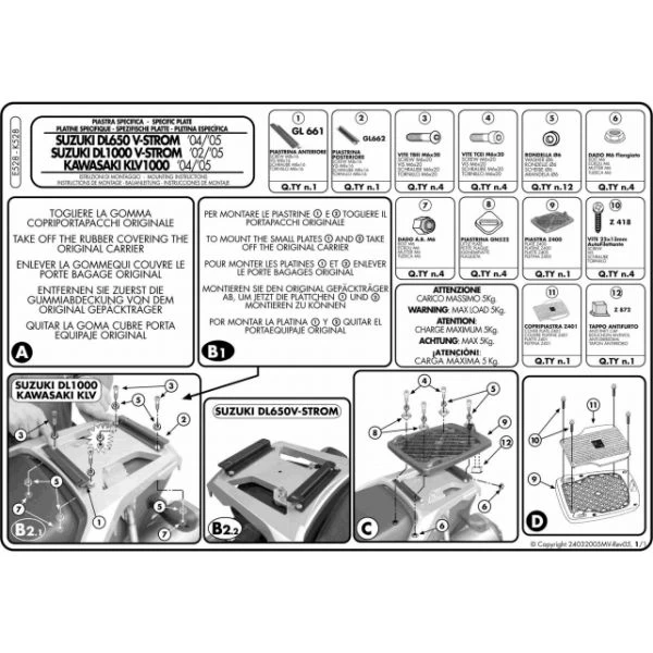 GIVI E528 Rear Plate Fitting Kit is a bike-specific kit to fit Kawasaki KLV 1000. The kit is designed to take GIVI Monokey Top Box which have a larger capacity than the Monolock Top Box. Monokey plate E250 is included in the kit. The GIVI E528 installs using simple hand tools.