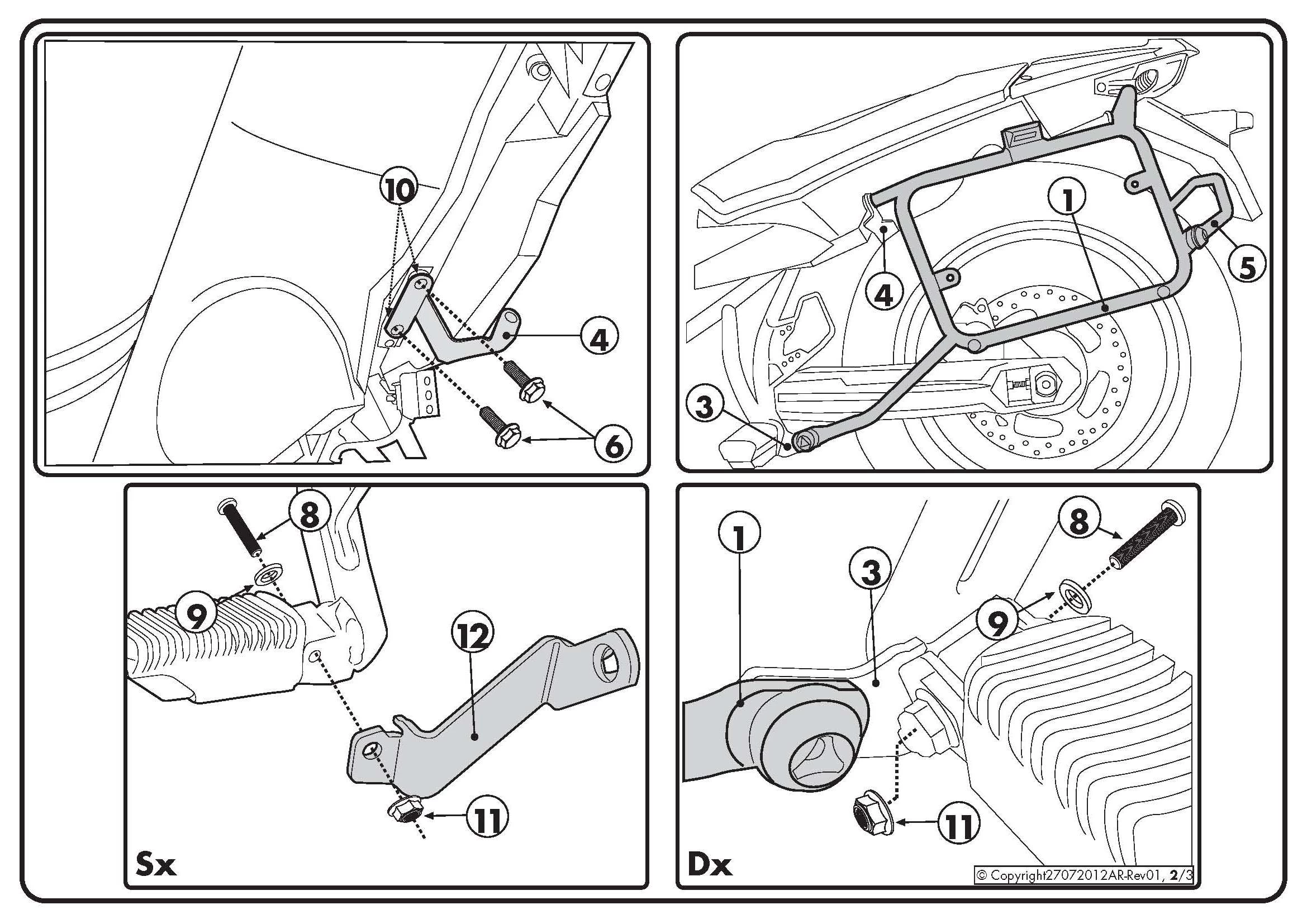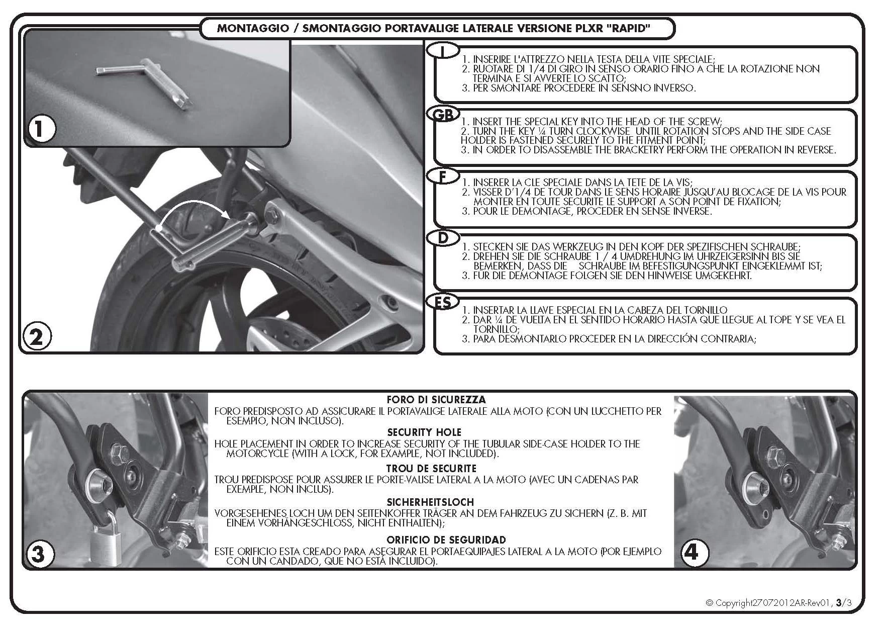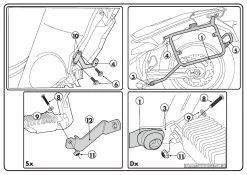 GIVI PLR5103 Pannier Holder is a bike specific tubular side case holder designed to take any of the GIVI Monokey side case range, except GIVI V35 and V35 tech side cases. The PLR5103 Rapid detachable rack system allows you to attach and remove the side-case rack quickly and easily. The system, designated as the PLR, is supplied with special semi-turn screws which allow you to attach the large, visible, sidecase hardware structure to much smaller supports that remain unseen. The fixing points are circled in red. Givi recommend you fit off-set panniers to make an allowance for the single exhaust on this bike. eg If selecting Givi Trekker Panniers go for a 46Ltr and a 33Ltr.