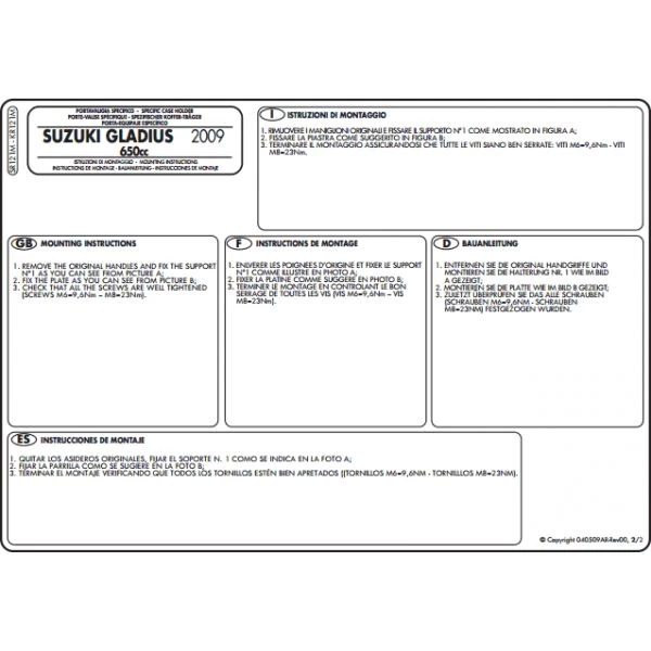 The kit is designed to take GIVI Monolock top boxes only. All parts needed to mount the GIVI SR121M Rear Plate are included. Installs using simple hand tools, you must remove the grab rails from the bike as they are reproduced by the kit itself. Maximum load allowed is 6 kg. Will not fit California models with emission canister.