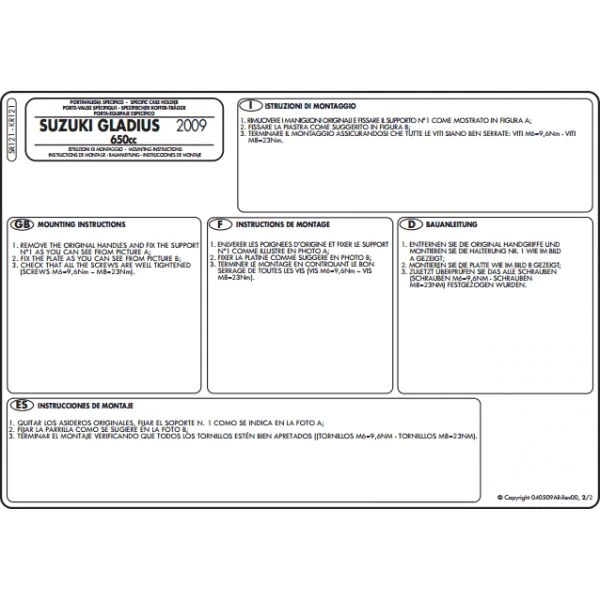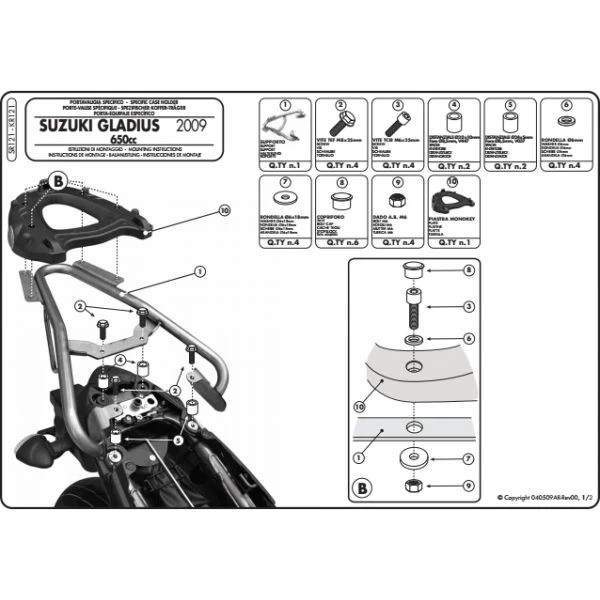 GIVI SR121 Rear Plate is made specifically for a Suzuki Gladius 650 (2009-current). The kit is designed to take GIVI Monokey Top Boxes only. All parts needed to mount the GIVI SR121 Rear Plate are included. Installs using simple hand tools, Monokey Plate M5 in nylon included. Please note, you must remove the grab rails from the bike as they are reproduced by the kit itself. Maximum load allowed is 6 kg. Will not fit California models with emission canister.