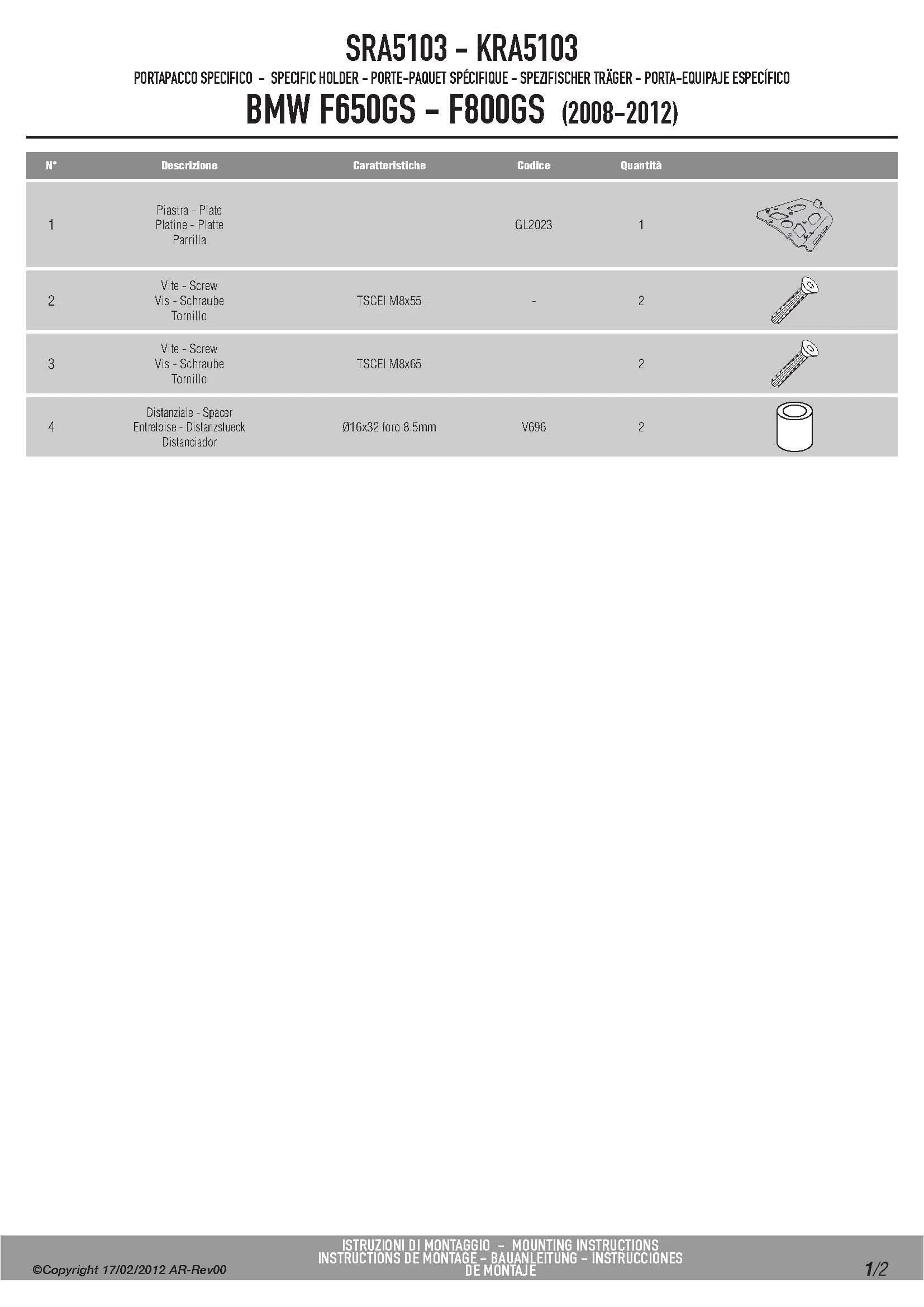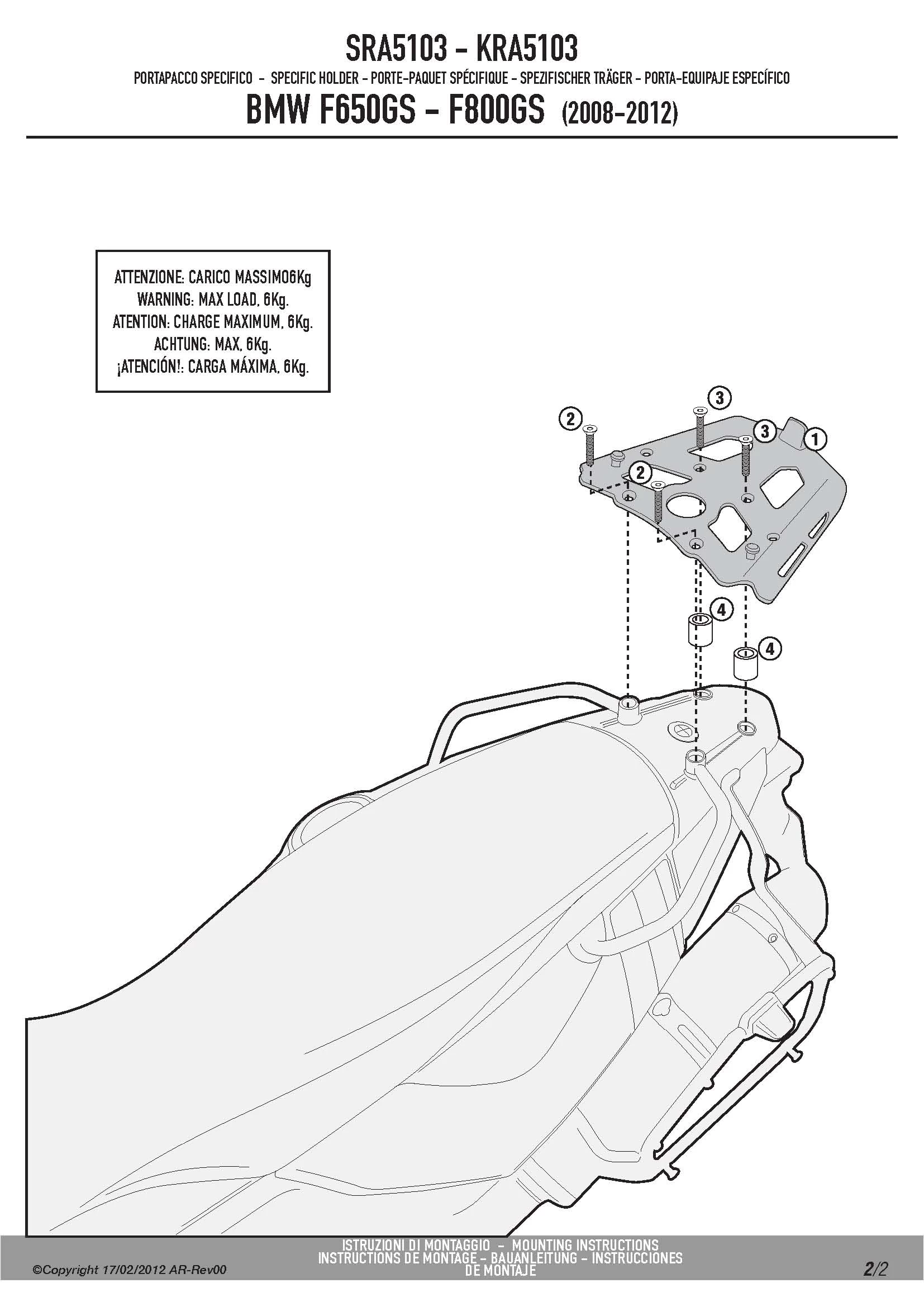 GIVI’s SRA5103 Top Case Rear Plate Monokey is made specifically for BMW F650GS (2008-current), F700GS (2013-current) and F800GS (2008-current). The kit is designed to take GIVI Monokey Top Boxes only. All parts needed to mount the GIVI SRA5103 Rear Plate are included. Installs using simple hand tools. maximum load allowed is 6 kg. It can be fitted with the original side case. Please note that neither the Givi stop light kit nor the Givi remote control key device can be used with this plate. Also, note that the SRA5103 can not be mounted with the PL690 pannier rack.