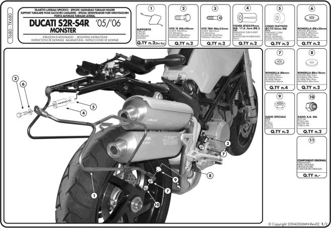 GIVI’s T680 Saddlebag Supports are made specifically for Ducati Monster S2R / S4R / S4RS 800 and 1000 (2004-2008). The T680 Pannier Holder is designed to take GIVI soft saddle Bags. The T680 carrier can be fitted regardless whether a top box is fitted or not. Installs with simple hand tools.