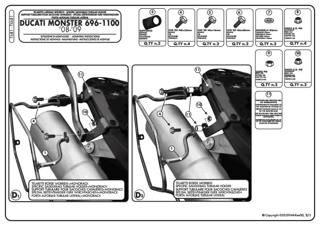GIVI’s T681 Saddlebag Supports are made specifically for Ducati Monster 696 / 796 and 1100 (2008-2012). The T681 Pannier Holder is designed to take GIVI Saddle Bags. Please note that this GIVI Saddle bag Holder must be mounted either in conjunction with GIVI 780FZ Monorack Arms or the 7400 Kit below: