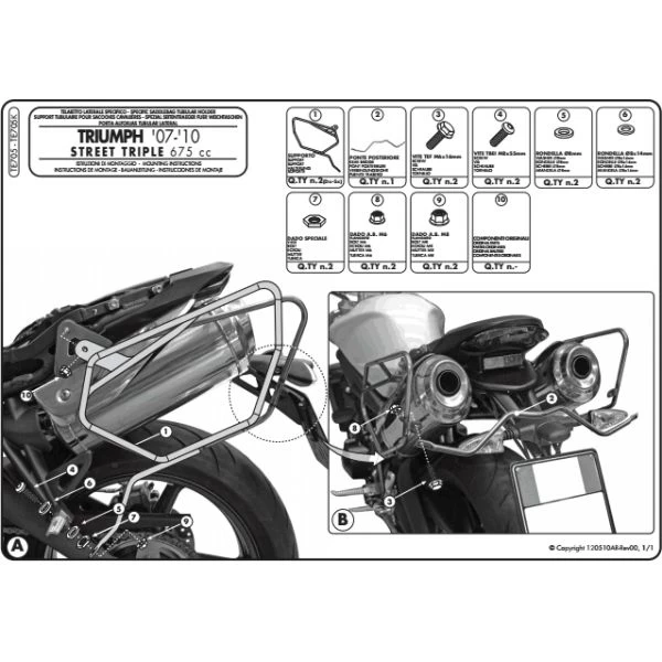 GIVI TE705 Pannier Holder is a bike-specific tubular side bag holder to fit Triumph Street Triple 675. The TE705 Pannier Holder is designed to take GIVI Easylock Bags, it can also be used to take soft luggage side bags. The TE705 easylock carrier can be fitted regardless whether a top box is fitted or not.